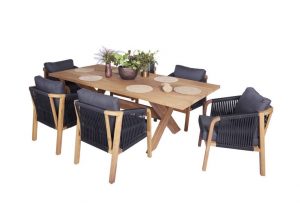 Ensemble d’une table et de 6 fauteuils cordés noirs, tout en bois massif d’iroko.